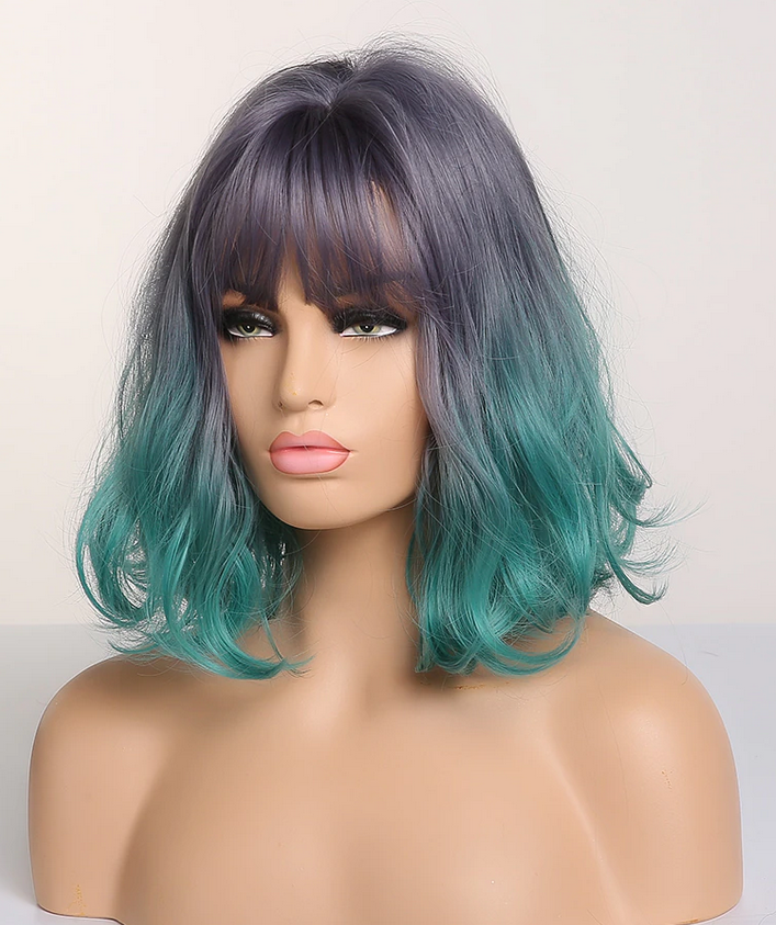 Heat resistant premium quality synthetic fiber wig, built-in cap, adjustable straps, giving a fantastic fantasy look with this green wavy bottom and dark roots short fantasy wig.